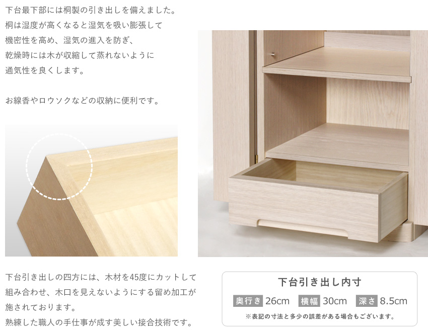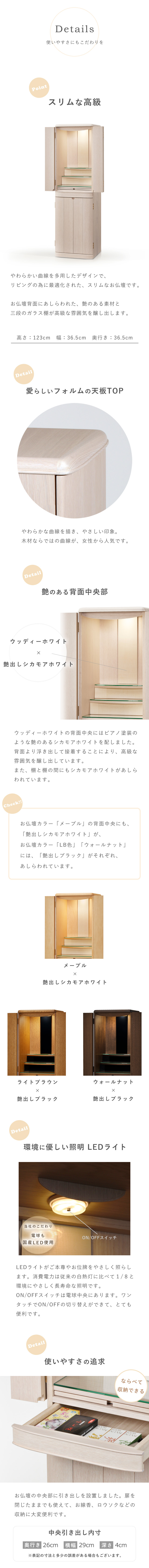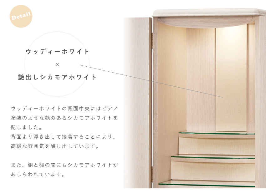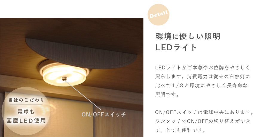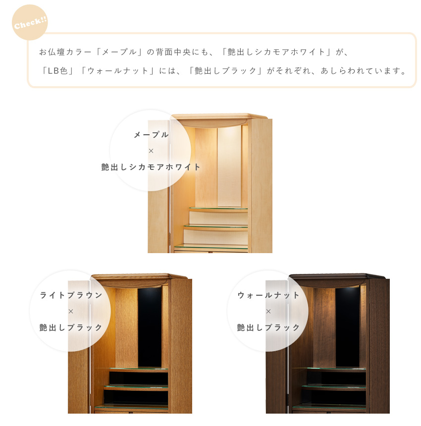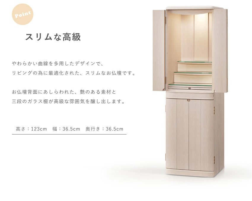 やわらかな曲線がお部屋に馴染むスリム&コンパクトなお仏壇当方では、安心してお取引頂けます様に当方の過失等による場合の返品、お取替えには、十分対応しております。 ※表記の寸法と多少の誤差がある場合もございます。 |