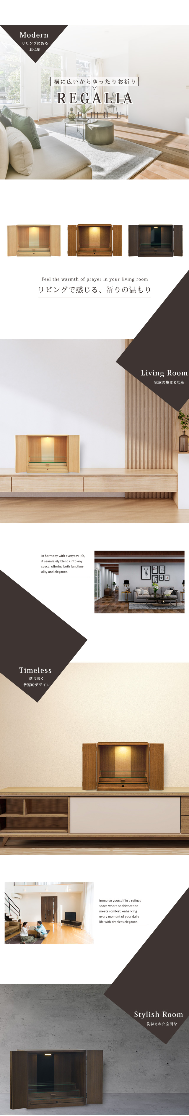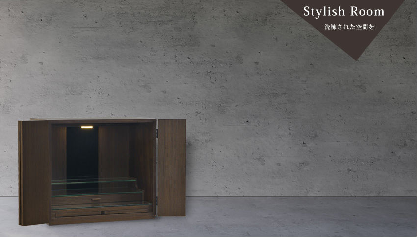 黒いチェストの上に置く予定で、黒でモダンなものを探していました。ショールームまで伺い、第一印象は黒の『ルーツ』。でも、実際に目で見て手で触って、帰宅してからも迷い『レガリア』のウォールナット色を購入しました。『レガリア』の扉の質感がとても良かったんです。