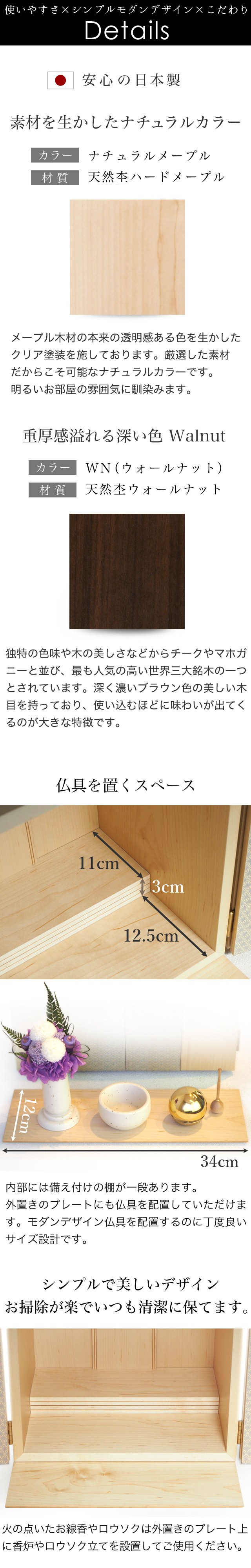 従来のお仏壇を置くスペースが充分に無いようなお部屋やアパートにも置ける、コンパクトサイズのお仏壇です。現代家具と相性の良いこだわりのモダンデザインで、お部屋のキャビネットやチェスト、リビングボードの上に設置できる上置きタイプです。