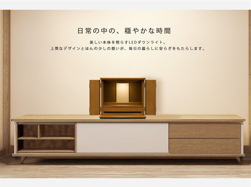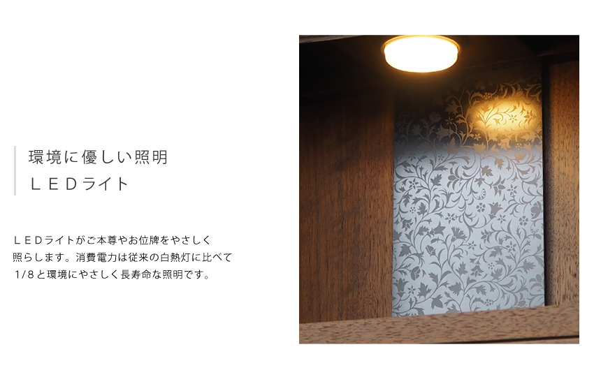 LEDライトがご本尊やお位牌を優しく照らします。長寿命で、消費電力は従来の白熱灯に比べて1/8と環境に優しい照明です。