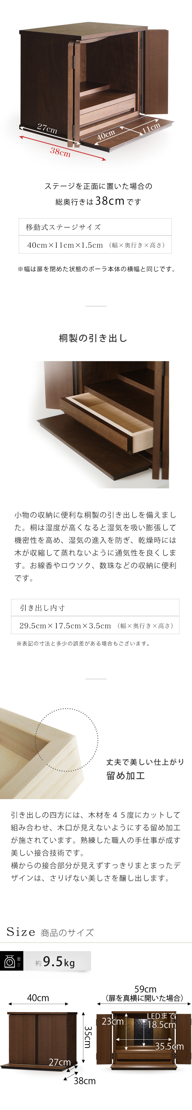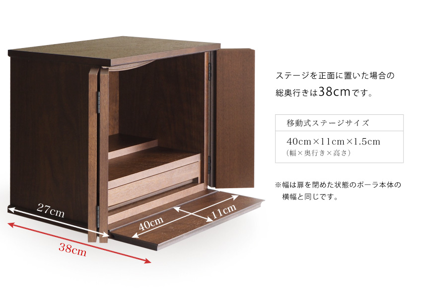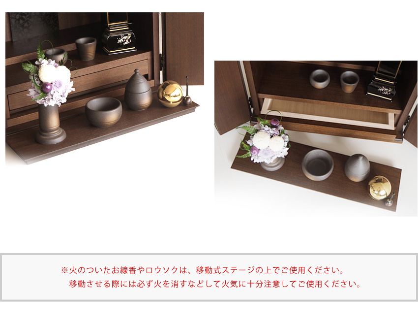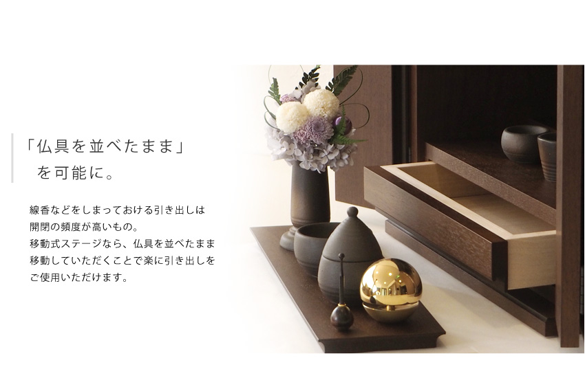 お線香などをしまっておける引き出しは開閉の頻度が高いもの。 移動式ステージなら、仏具を並べたまま移動していただくことで楽に引き出しをご使用いただけます。ステージを正面に置いた場合の総奥行きは38cmです。 移動式ステージサイズ: 横幅40cm × 奥行き11cm × 高さ1.5cm