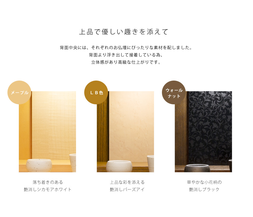 背面中央部には、それぞれのお仏壇にぴったりな素材を配しました。背面より浮き出して接着している為、立体感があり高級な仕上がりです。