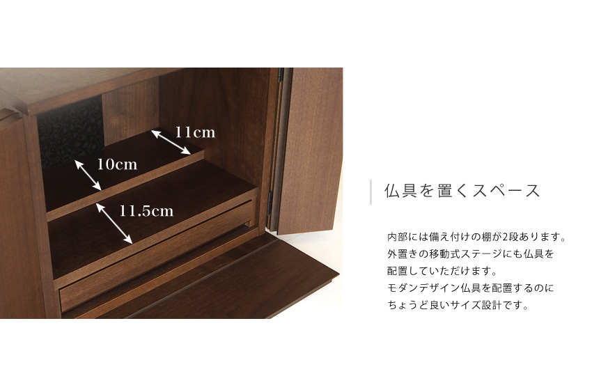 内部には備え付けの棚が2段あります。外置きの移動式ステージにも仏具を配置していただけます。モダンデザイン仏具を配置するのにちょうど良いサイズ設計です。
