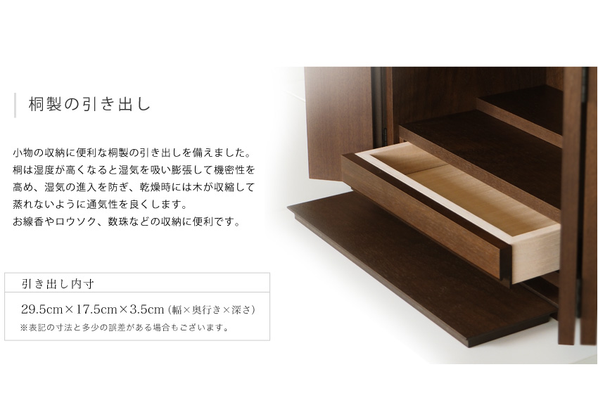 桐は湿度が高くなると湿気を吸い膨張して機密性を高め、湿気の進入を防ぎ、乾燥時には木が収縮して蒸れないように通気性を良くします。 お線香やロウソク、数珠などの収納に 便利です。